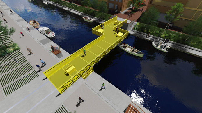,,Een stoer, industrieel ding”, dat was het beoogde uitgangspunt bij deze uniek brug aldus de architect. “Dat past ook bij het verleden van de wijk, want de Vliet was belangrijk voor de verschillende fabrieken die daar in de buurt hebben gestaan. Dergelijke bruggen zie je niet vaak meer, maar nog wel in de havenindustrie.” Thans wordt deze industriële wijk getransformeerd tot een hippe aantrekkelijke woonwijk, voorzien van een heuse waterkom en een mogelijkheid voor tribuneopbouw op het water. De brug moet echt een herkenningspunt zijn, meest opvallend is toch wel de felgele kleur en de asymmetrische vorm.